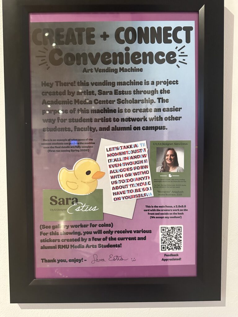 The “Create + Connect Vending Machine,” formerly known as “Art at Convience” is a flat tattoo/sticker vending machine that has been repurposed to be used as a machine that dispenses “trading cards” and other collectibles created by students, alumni, and faculty at Robert Morris University in Moon Township, PA.
