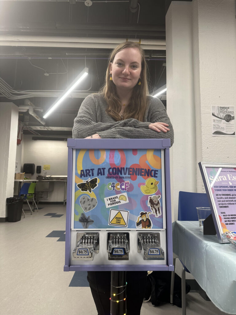 Inside the machine, there are cardboard sleeves that will contain a “trading card” that will have RMU student art on the front, and their information, such as social media, name of the piece, and any other information they would like to share. There can also be extras, I have been calling “goodies” which can consist of stickers, business cards, notes, doodles, etc. Truly, anything that can fit into the cardboard sleeve and not jam the machine can go into the card. (With discretion)