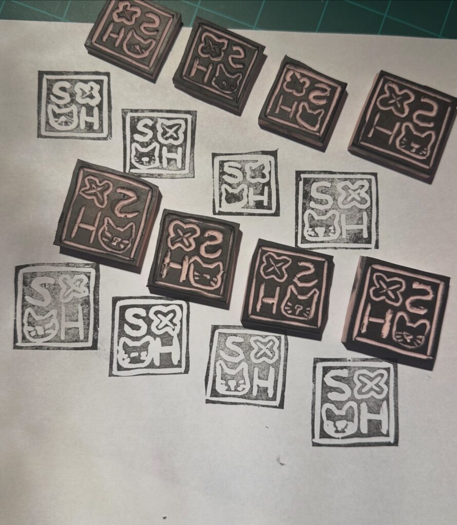 I actually took the final square drawing I created, image-traced it in Adobe Illustrator for digital formatting, and made a real stamp for physical work!