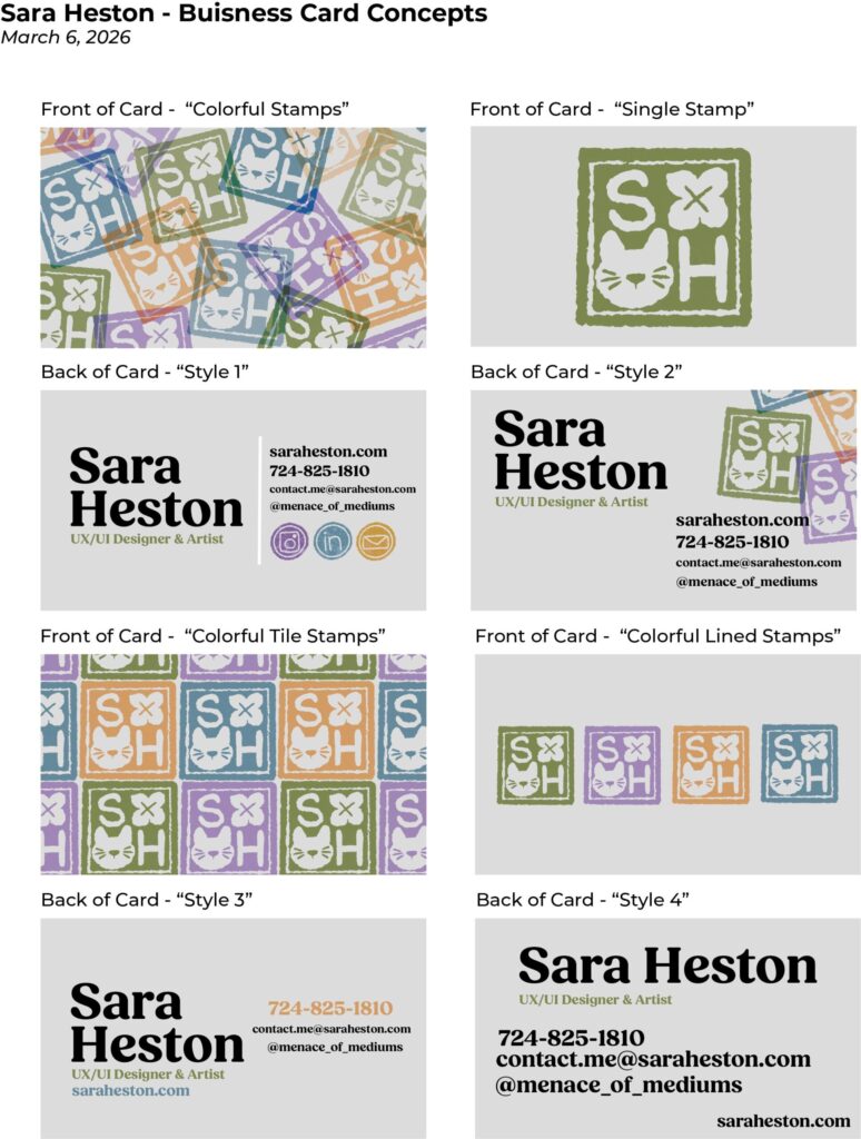 Here is my overall color palette, fonts, logos, and icons I came up with for my brand. I decided to go with Fields, bold for my main branding font, such as using it for my name and info on documents like business cards, letterheads, and logos. But I use Montserrat for body text on everything else. For logos, I still use my stamp design, but I like to incorporate different colors for it, as well as characters, such as my rabbit Darwin and my cat Buster, since I’ve illustrated them in a lot of my personal work, plus they are my pets.