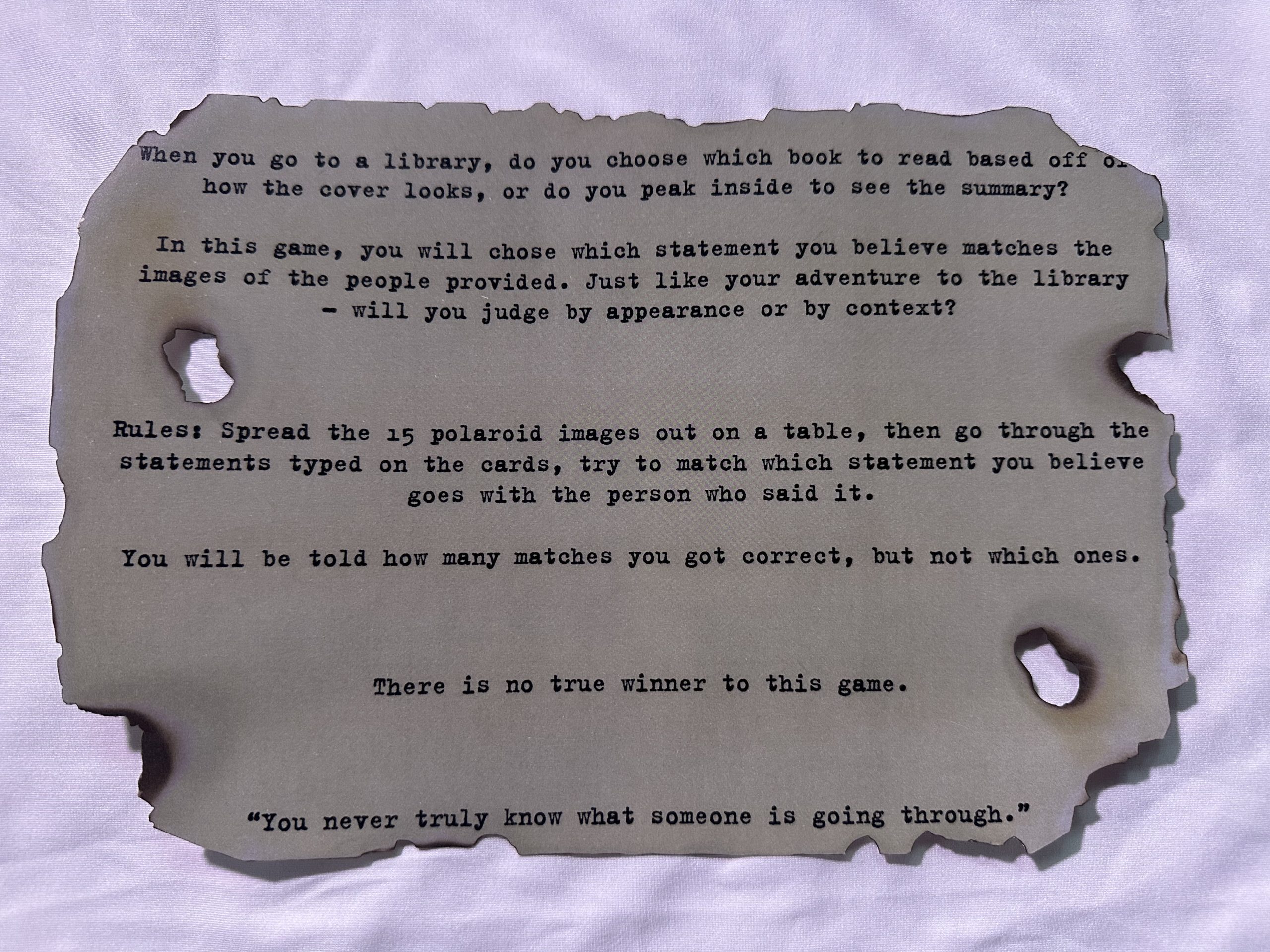 “Superficial” is a card game about avoiding assumptions about people based on the limited information provided about them, such as a photo of them, name, age, pronouns, and occupation. However, this game challenges the urge not to assume anything, as players are tasked with matching their photos to a statement they made about an experience they’ve had, whether good or bad.