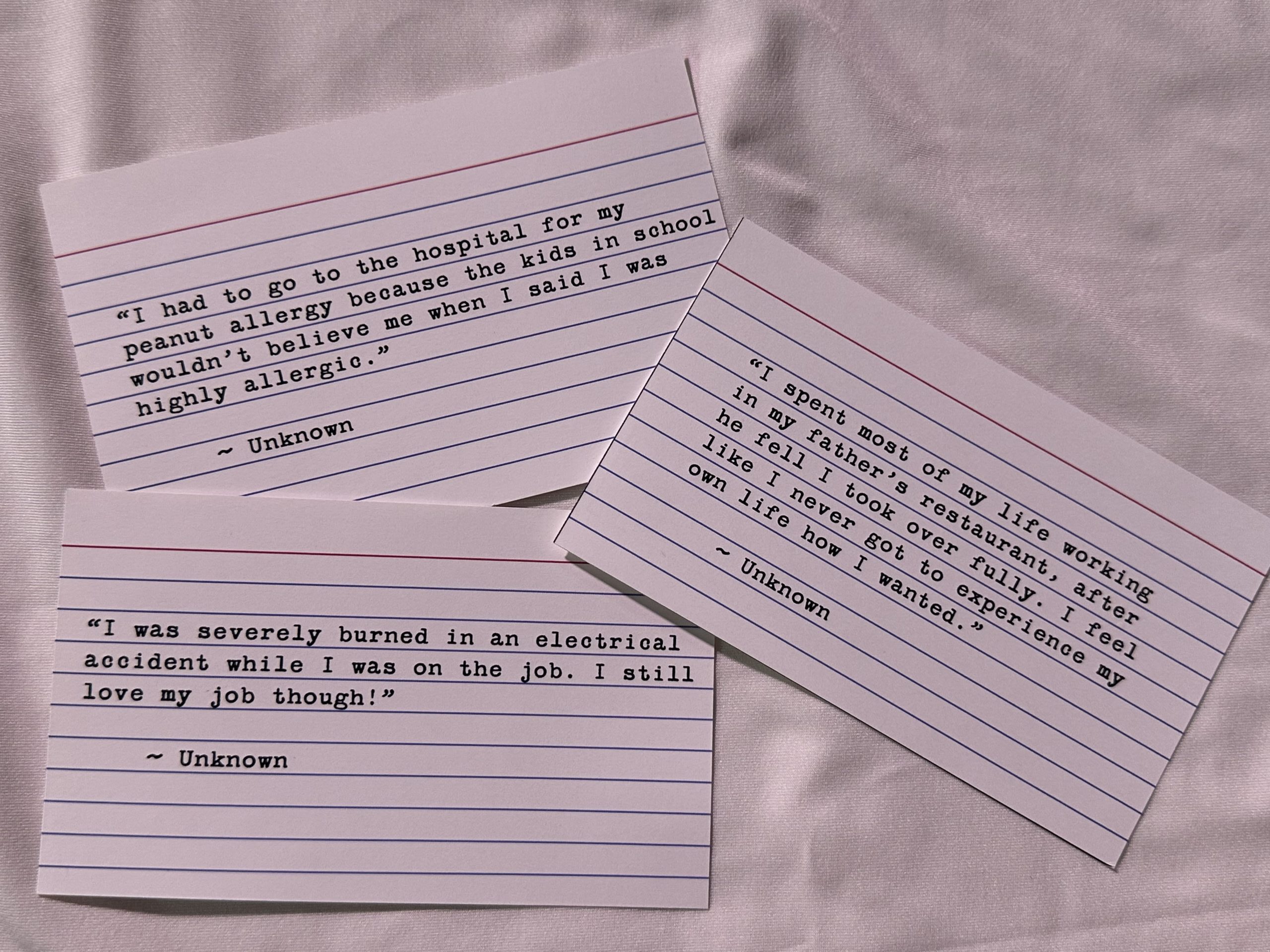 The original format of the game contained hand-drawn photos of friends, colleagues, and family members, and their real stories. Later, the game was changed to have people created by artificial intelligence, as it was intended to test the maximum number of people that could be in the game. With further testing, it was found that by creating more explicit statements, players felt more empathy for the characters. As it can be a challenge to try to convince real people to share their trauma, with this new version, no one needed to feel inclined to do so, still creating a realistic experience, while preventing harm.